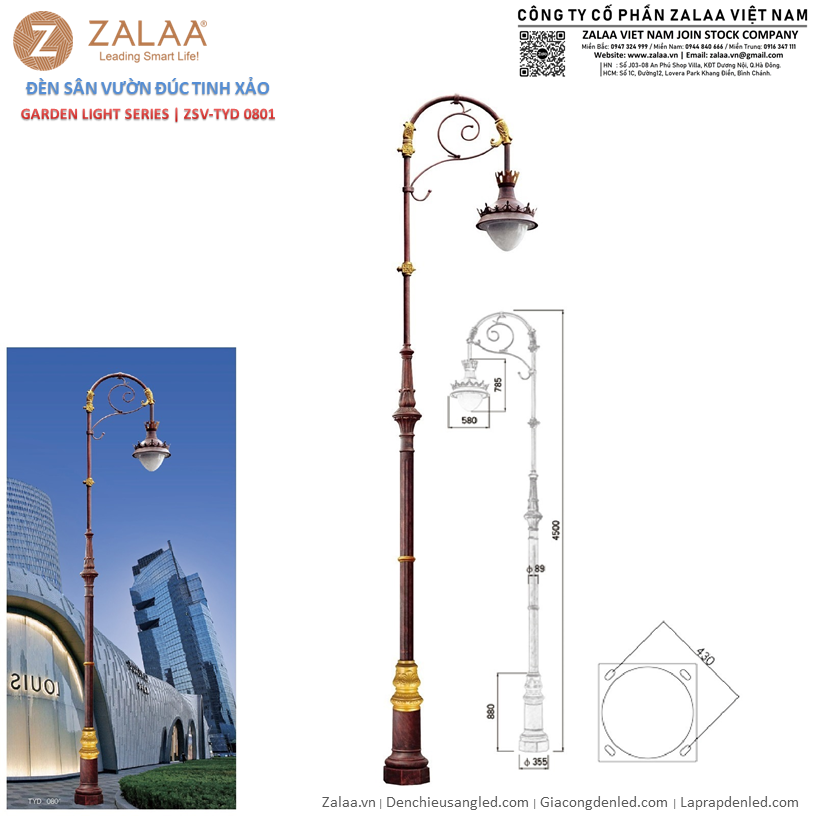 Cột Đèn Sân Vườn 1 bóng đèn Nữ Hoàng Châu Âu, kiểu dáng tân cổ điển ZSV_TYD-0801 ZALAA OEM chiếu sáng biệt phủ, villa, dinh thự cao cấp cao 4-5m, với 1 tay gắn đầu đèn mai chiếu thủy của ZALAA Lighting, nhôm đúc cao cấp, chóa PC chống va đập, phù hợp chiếu sáng cảnh quan công viên, biệt thự, dự án đô thị, ZALAA nhận thiết kế OEM/ODM theo yêu cầu, giá cạnh tranh, hỗ trợ tư vấn kỹ thuật tận nơi.