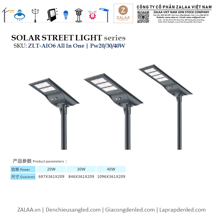 Bạn đang tìm giải pháp chiếu sáng tất cả trong một sản phẩm cho dự án/công trình hướng đến bền vững, năng lượng xanh? ZALAA xin giới thiệu Đèn Đường LED Năng Lượng Mặt Trời ZLT-AIO6 All In One Pw20/30/40W – Solar Street Light ZALAA