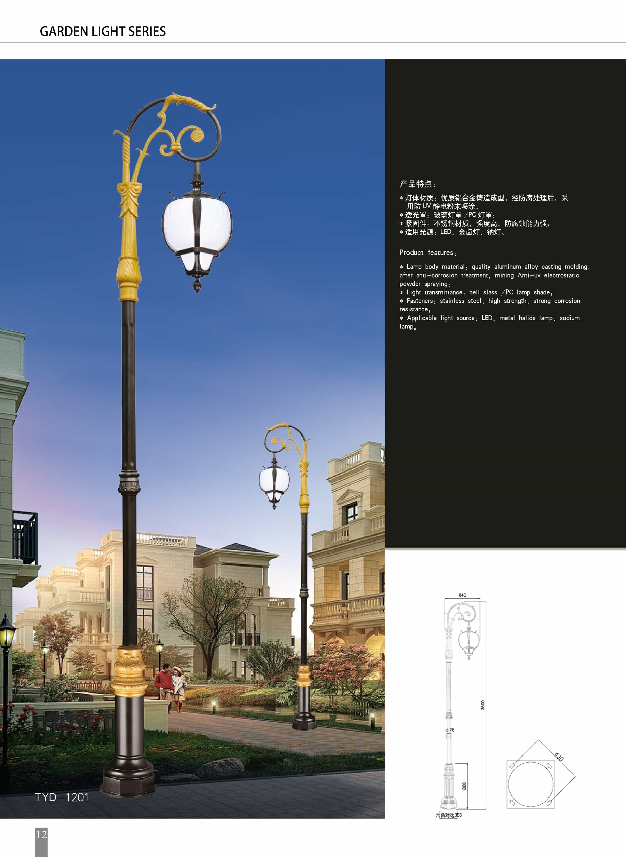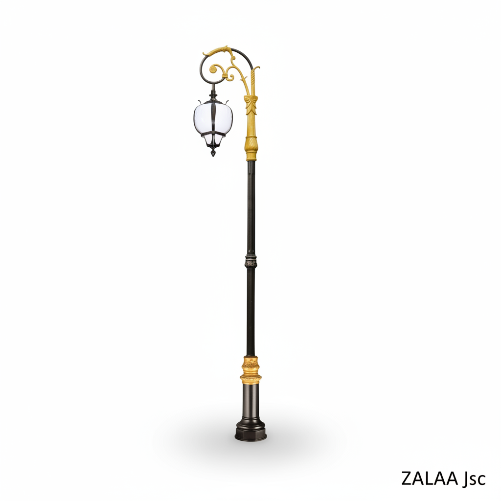 Đèn sân vườn mã ZSV_TYD-1201 của ZALAA Lighting nổi bật với thân cột nhôm đúc nguyên khối, phủ sơn tĩnh điện chống tia UV, chống ăn mòn, hoa văn trang trí tinh xảo, màu sắc phối vàng đồng tạo điểm nhấn sang trọng cho công trình.