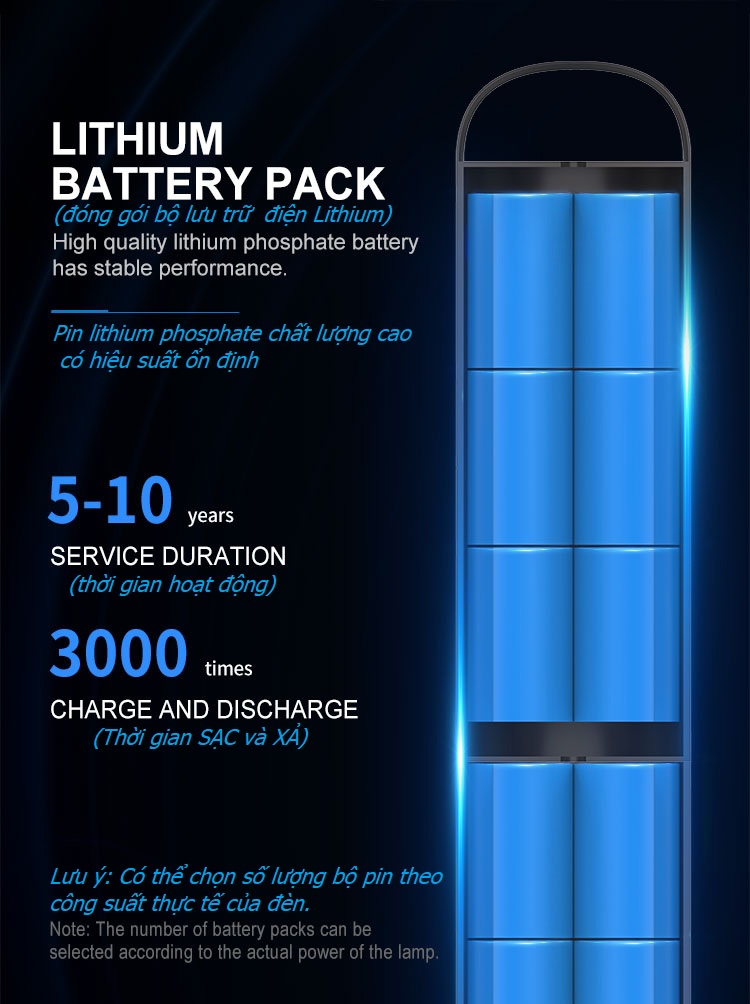 | Chế độ điều khiển (auto dimming) | 100% 0.5h + 80% 2.5h + 50% 2h + 20% 7h (3 có mây và mưa ngày) |