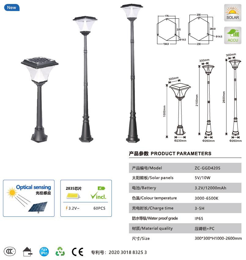 ZG-GGD4205 là mẫu Cột Đèn Trang Trí Hiện Đại sử dụng năng lượng mặt trời để chiếu sáng cảnh quan sân vườn, đường dẫn vào các khu căn hộ chung cư, nhà ở, homestay, khách sạn, nhà nghỉ cao cấp, villages, biệt thự,… Sản phẩm bao gồm cả cột đèn có loại cao từ 1M và 2,6M với Chip LED 2835, DC5V/10W / AC 220V/30W