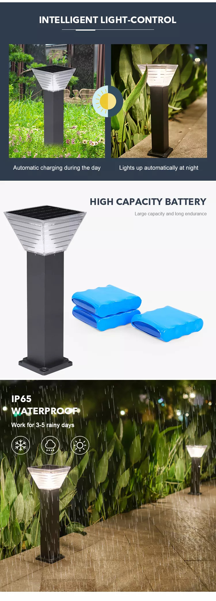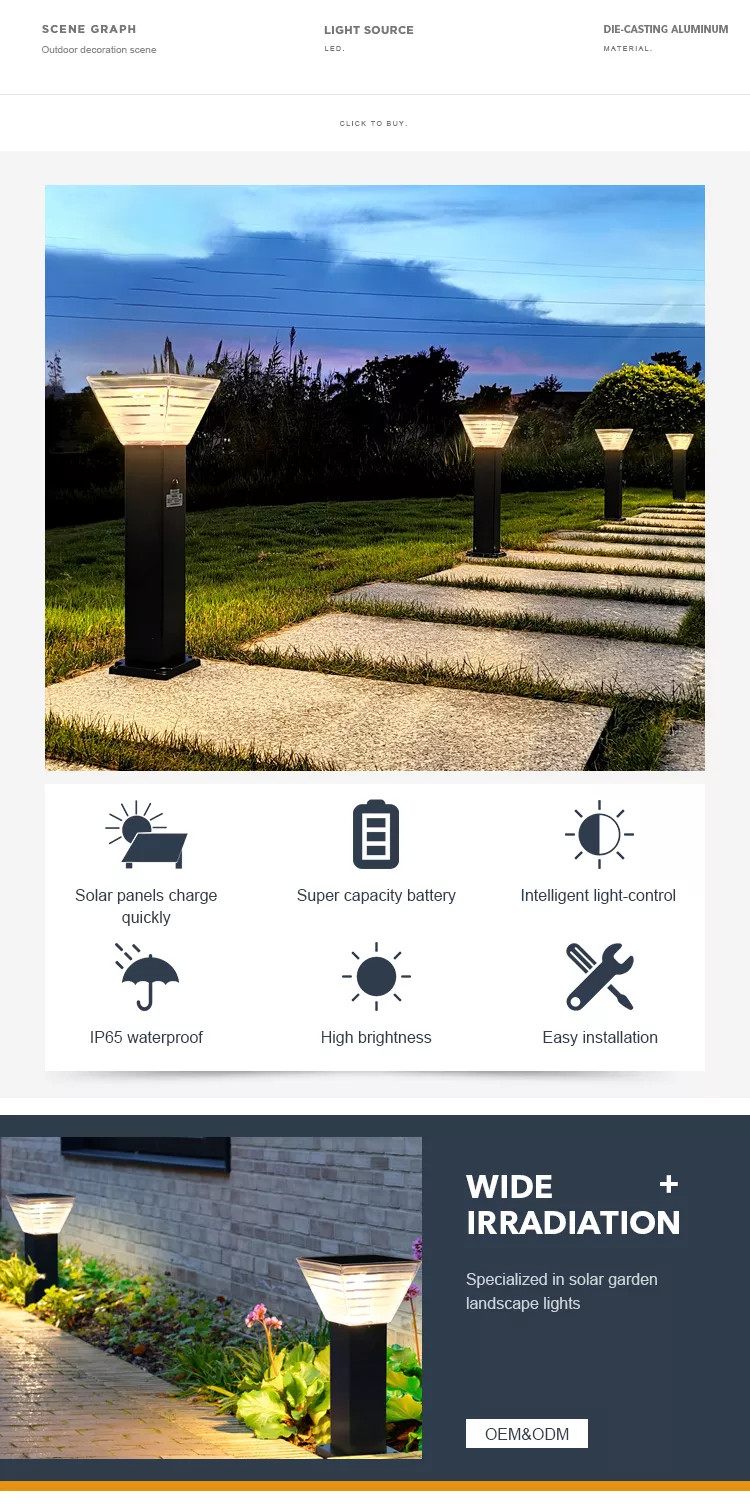 ZG-CPD5004 là mẫu Đèn LED Trụ Sân Vườn, cột đèn thấp IP65, Sử dụng năng lượng mặt trời để chiếu sáng trang trí các không gian như cảnh quan đường đi, bãi cỏ ngoại thất tòa nhà, Biệt thự nhà vườn, Villa nghỉ dưỡng, Shophouse hiện đại, Homestay cao cấp, vv...Công Suất Tấm Pin/Đèn 5V/5W-Mono, Pin: 3.2V 6400mAh LiFePO4.