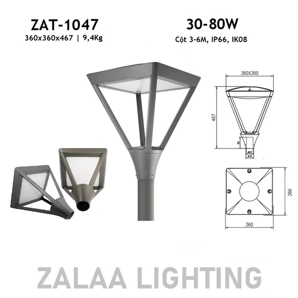 Đèn LED Chiếu Sáng Công Viên, Trang Trí Cảnh Quan ZAT-1047 Công suất Từ 30W đến 80W Phù Hợp Cho Cột Cao Từ 3-8M