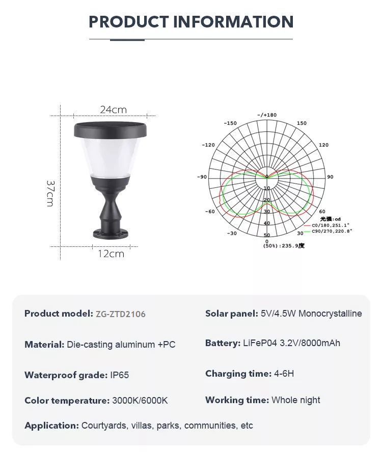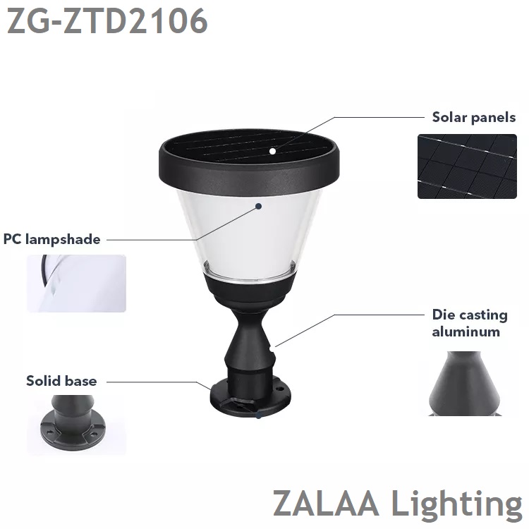 ZG-ZTD2106 là đèn trụ cổng tường rào, trụ cột hàng rào,...IP65, Sử dụng năng lượng mặt trời để chiếu sáng dùng cho các không gian như cảnh quan sân vườn, biệt thự, công viên, vui chơi picnic cộng đồng, vv...Công Suất Tấm Pin/Đèn 5V/4.5W, . Sản phẩm do ZALAA Solar Garden nhập khẩu và phân phối tại Việt Nam.. Giá bán trên web là tham khảo, các chủ đầu tư sẽ được báo theo giá cấp cho dự án, công trình