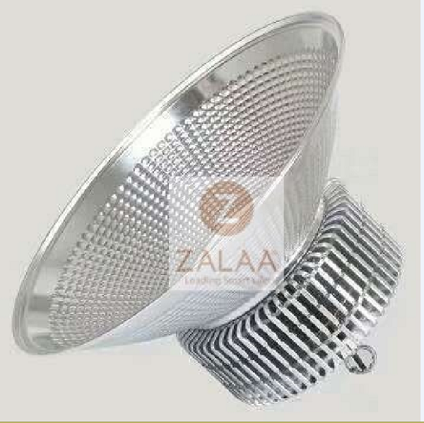 - Chao đèn loe rộng, bề mặt của còn có những đường viền ngang dọc. Bộ phận này của đèn LED highbay được tráng bạc, tạo độ phản quang.
