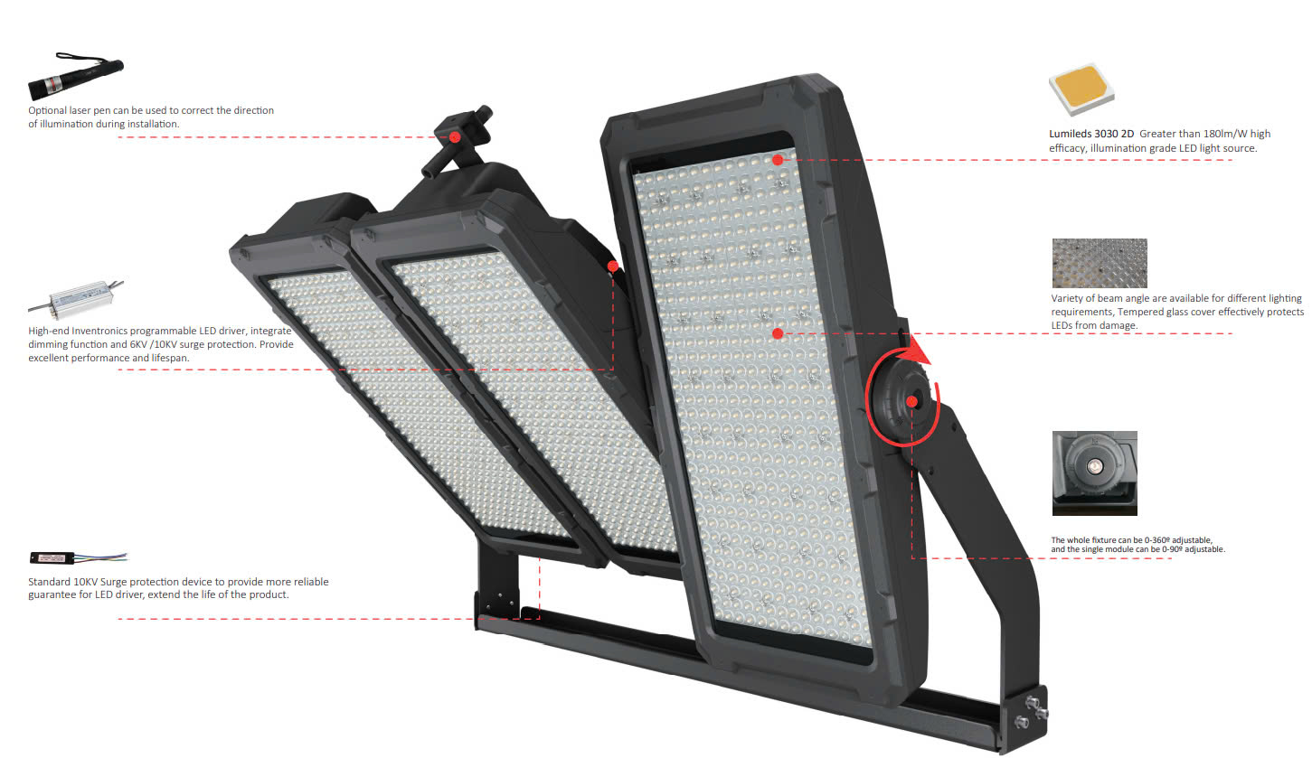 - Đáp ứng nhu cầu chiếu sáng đa dạng: Có thể sử dụng cho nhiều mục đích khác nhau như chiếu sáng sân ga, bãi đỗ xe, sân vận động, nhà xưởng...