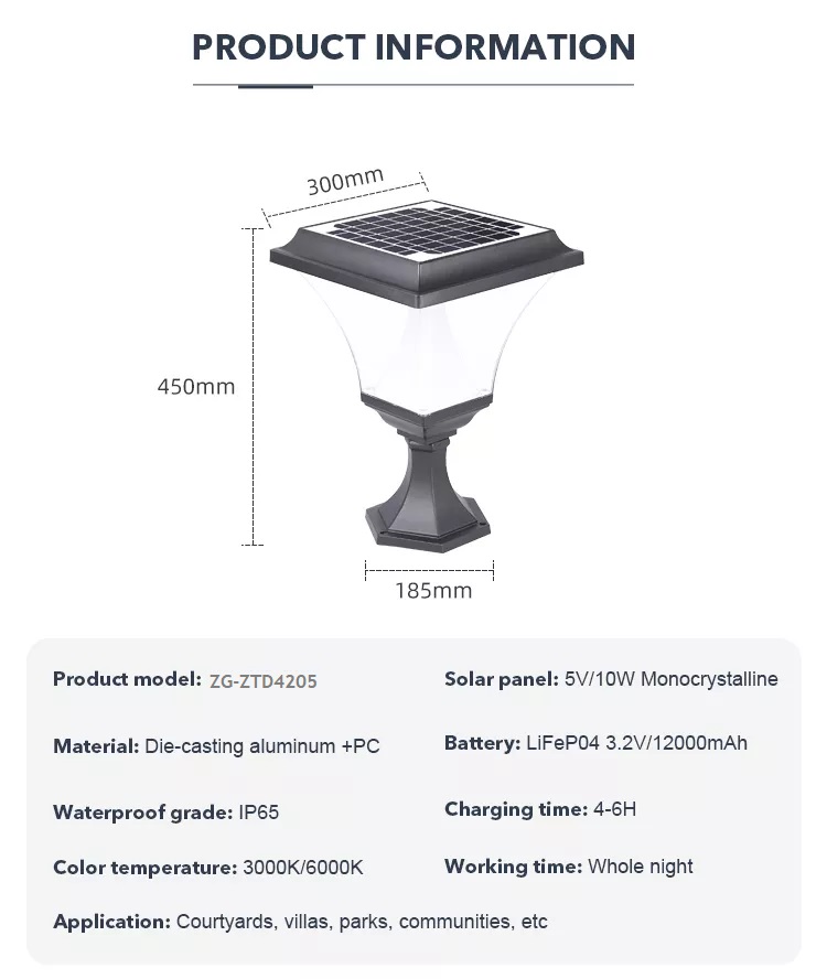 ZG-ZTD4205 là đèn trang trí trụ cột, trụ cổng hàng rào, tường rào sân vườn ngoài trời có kiểu dáng vuông đầu, Sử dụng năng lượng mặt trời để chiếu sáng dùng cho các không gian như cảnh quan sân vườn, biệt thự, công viên, vui chơi cộng đồng, vv...Công Suất Tấm Pin/Đèn 5V/10W. Sản phẩm do ZALAA Solar Garden nhập khẩu và phân phối tại Việt Nam.. Giá bán trên web là tham khảo, các chủ đầu tư sẽ được báo theo giá cấp cho dự án, công trình